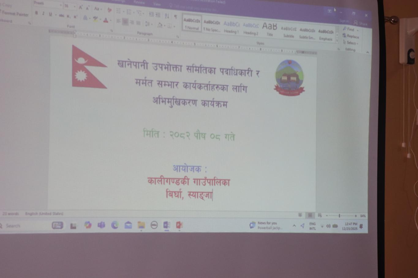 गाउँपालिका अध्यक्ष श्री खिम बहादुर थापा ज्यूको अध्यक्षतामा सञ्चालित उक्त कार्यक्रममा खानेपानी उपभोक्ता समितिहरूलाई सुरक्षित, स्वच्छ तथा गुणस्तरीय खानेपानीको महत्वबारे जानकारी गराइएको थियो। विशेषगरी, कालीगण्डकी गाउँपालिकाले आफ्नै लगानीमा खानेपानीको गुणस्तर परीक्षणका लागि प्रयोगशाला (ल्याब) स्थापना गरिसकेको तथ्यलाई कार्यक्रममा जोड दिँदै प्रस्तुत गरिएको छ, जसले स्थानीयस्तरमै नियमित र विश्वसनीय परीक्षण सम्भव बनाएको छ।