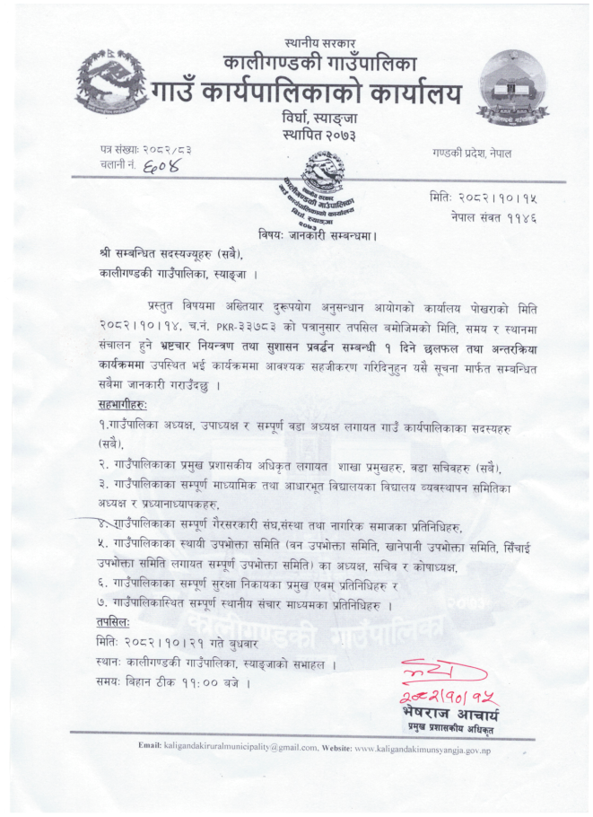 भष्ट्राचार नियन्त्रण तथा सुशासन प्रबद्धर्न सम्बन्धी कार्यक्रममा उपस्थित सम्बन्धमा ।