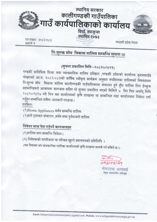 निःशुल्क सीप विकास तालिम सम्बन्धी सूचना।