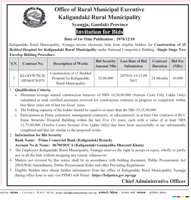 Construction of 15 bedded Hospital सम्बन्धी बोलपत्र आव्हानको सूचना !!